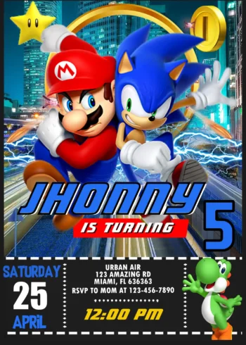 This digital Mario vs Sonic Birthday Invite features the two biggest video game legends, Mario and Sonic the Hedgehog, racing into action together! Set against a futuristic city backdrop with classic game items, this invitation creates a thrilling first impression for a party that’s all about speed, adventure, and non-stop fun.