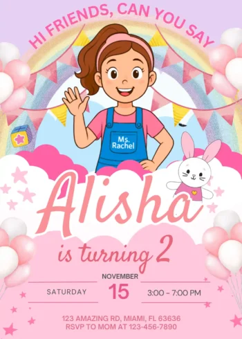 This digital Ms. Rachel Birthday Invite brings the joy of “Songs for Littles” to your home! It stars the internet’s favorite teacher, Ms. Rachel, and a cute bunny companion. The theme captures the gentle, educational, and interactive spirit of her videos, making it the perfect start for a sweet and engaging birthday party.