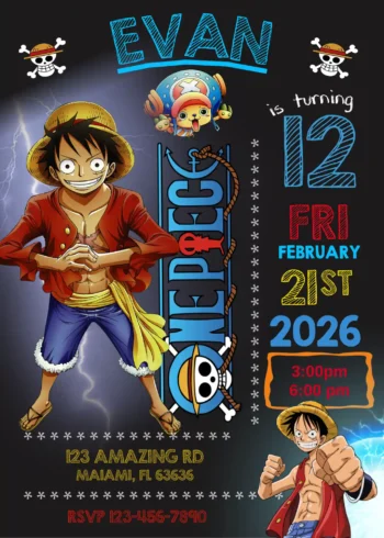 Set sail for the Grand Line and celebrate in legendary style! This action-packed editable One Piece Birthday Invitation template is the perfect way to gather your crew for an adventure they’ll never forget. Announce the big day with a thrilling, anime-inspired design that promises a treasure trove of fun for your child and their friends.